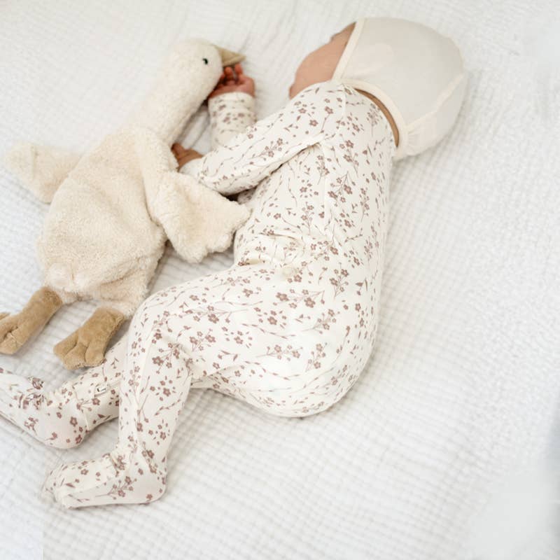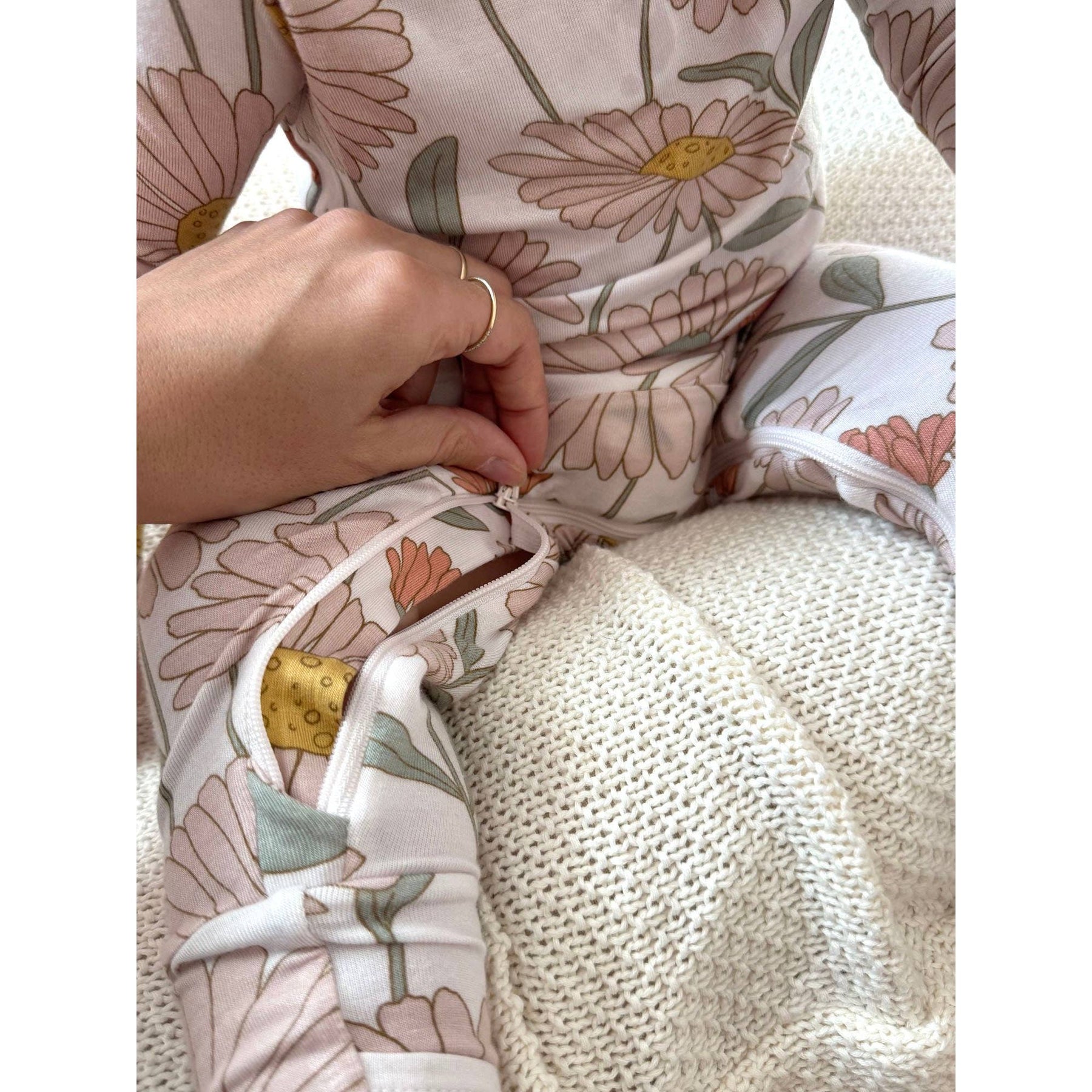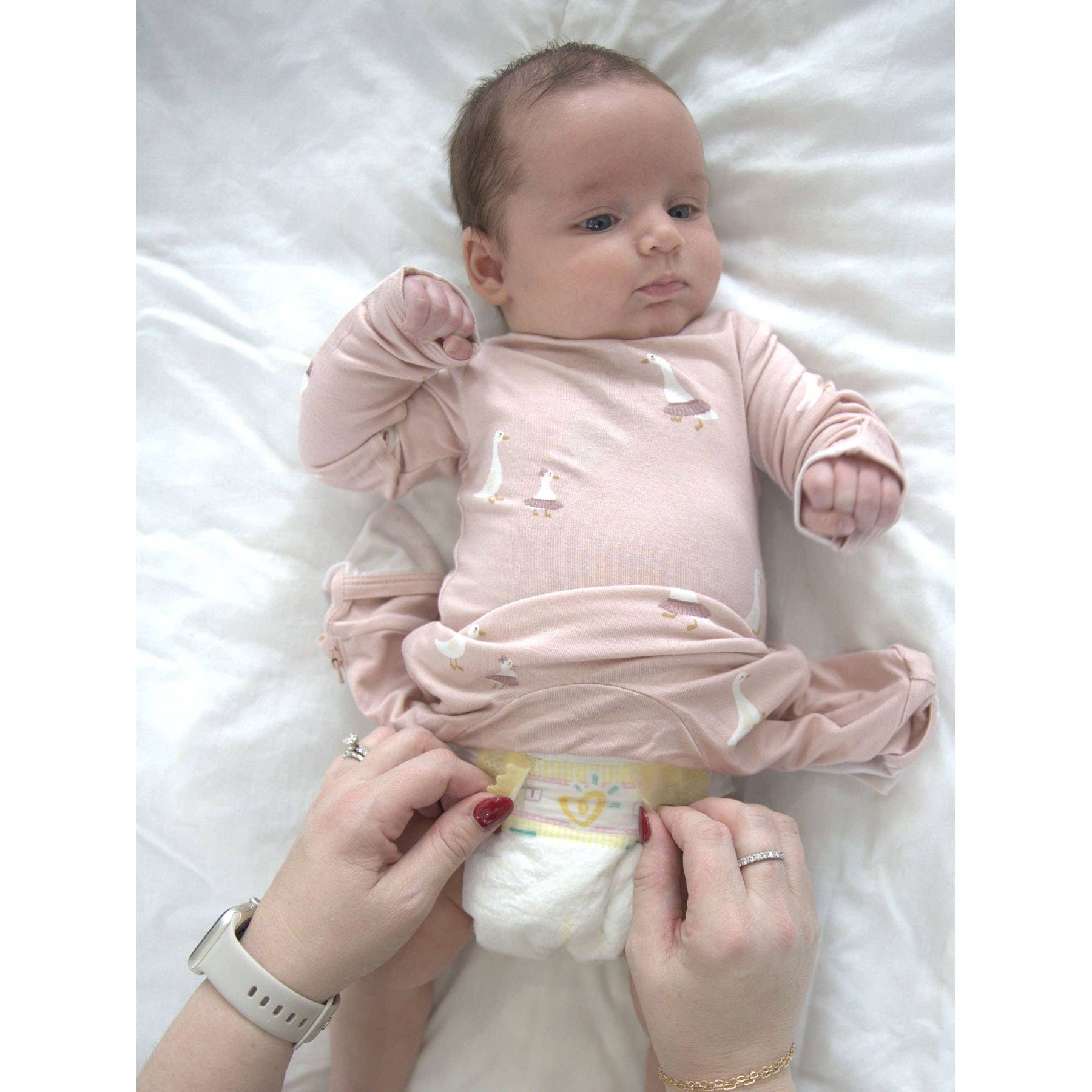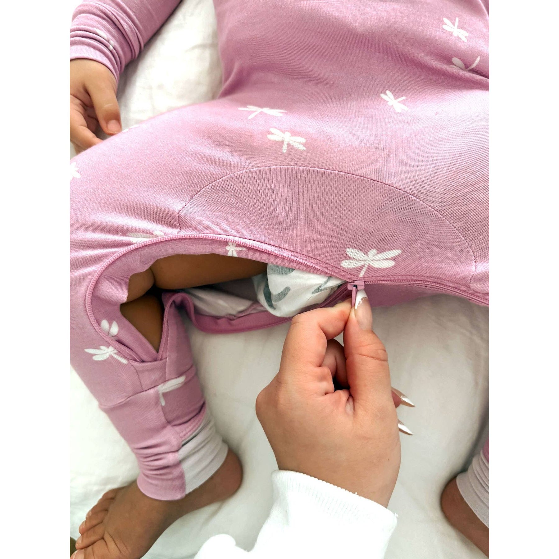 Convertible Pajama for babies - a versatile two-in-one solution, with or without footies. Made from silky soft bamboo rayon, this pajama ensures baby stays covered and cozy while making diaper changes a breeze with our exclusive DIAPER-ZiP®. Day or night, number one or number two, changes are effortless. Simply flip the footie up when your little one wants to walk. Featuring built-in optional hand mittens to prevent scratching and provide added warmth, a lap shoulder neckline for easy on and off, and only one zipper for optimal comfort, this pajama is designed for both convenience and comfort.