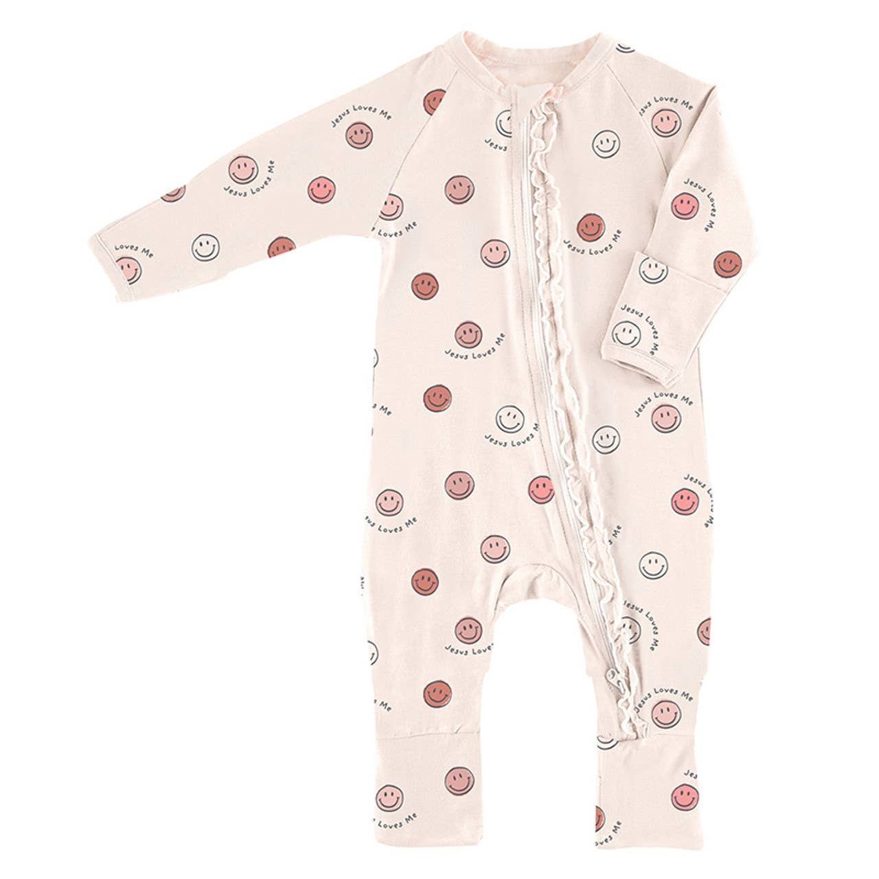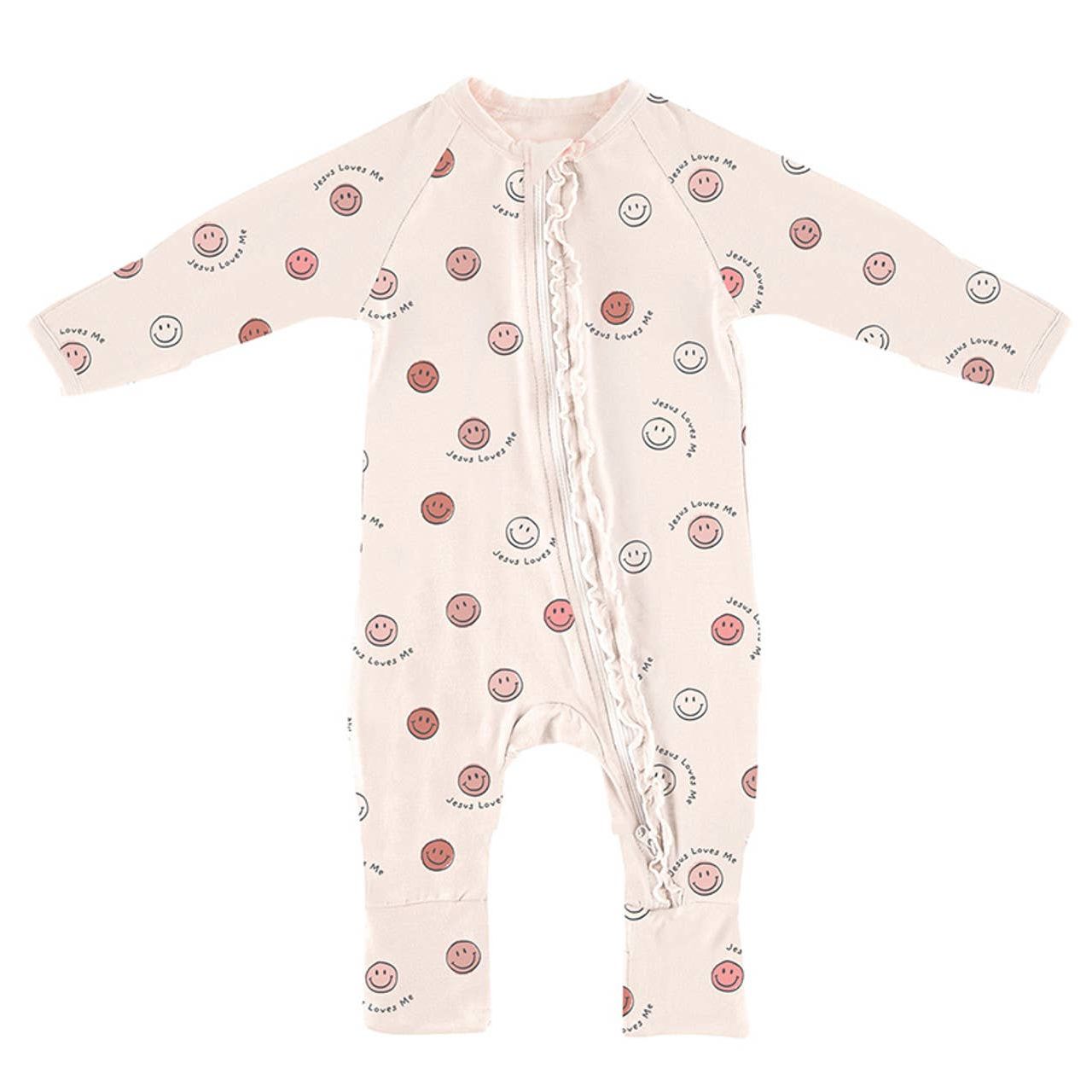 Keep baby smiling with this adorable "Jesus Loves Me" Cozy Romper, featuring happy smiley faces and a sweet reminder of love that are sure to brighten the day! Made of super soft bamboo blend fabric ensuring both style and comfort for baby! •Made of 95% Viscose from Bamboo and 5% Spandex for softness and stretch •Features a two-way zipper for easy changing •Designed with foldover cuffs to prevent scratches and foldover feet to extend wearing options