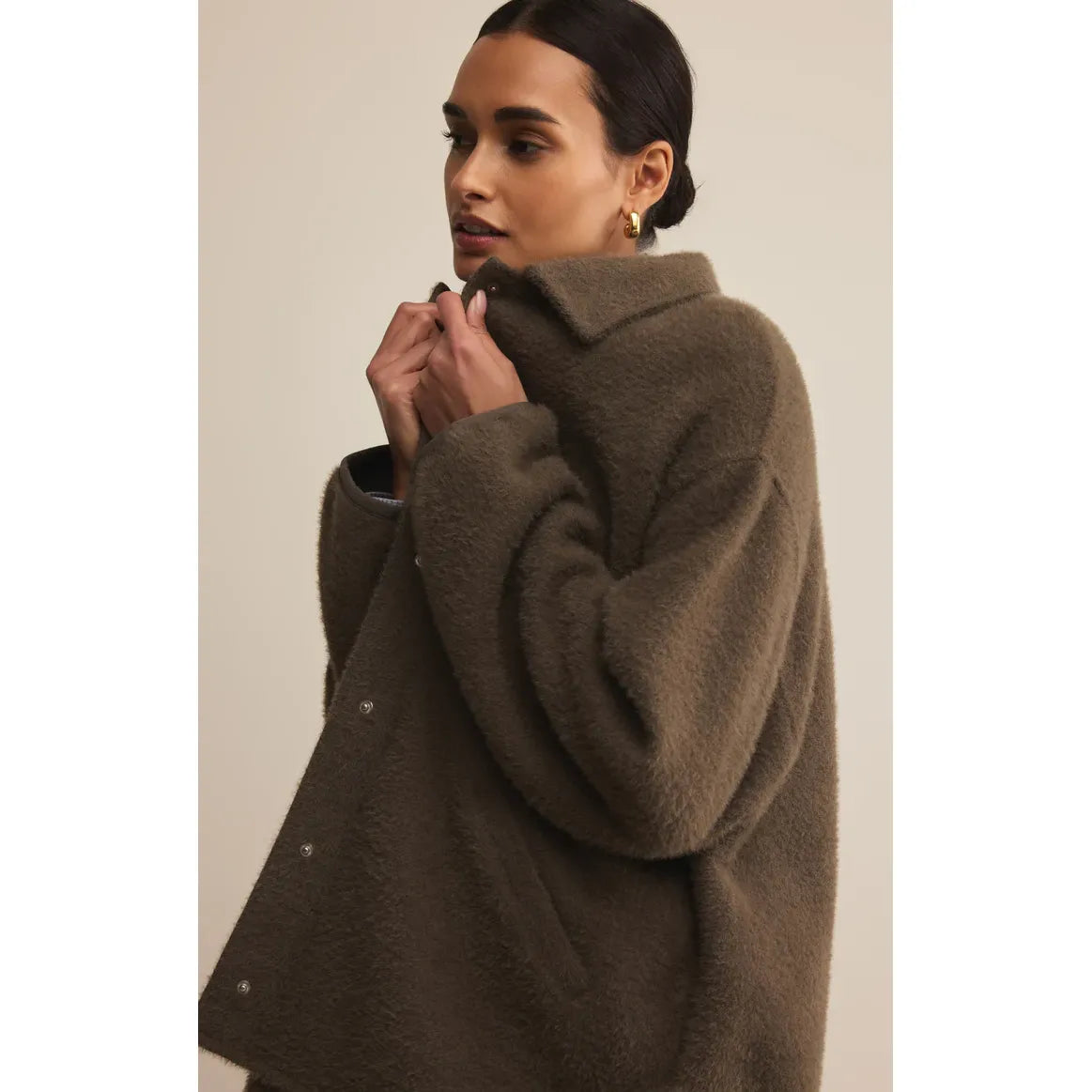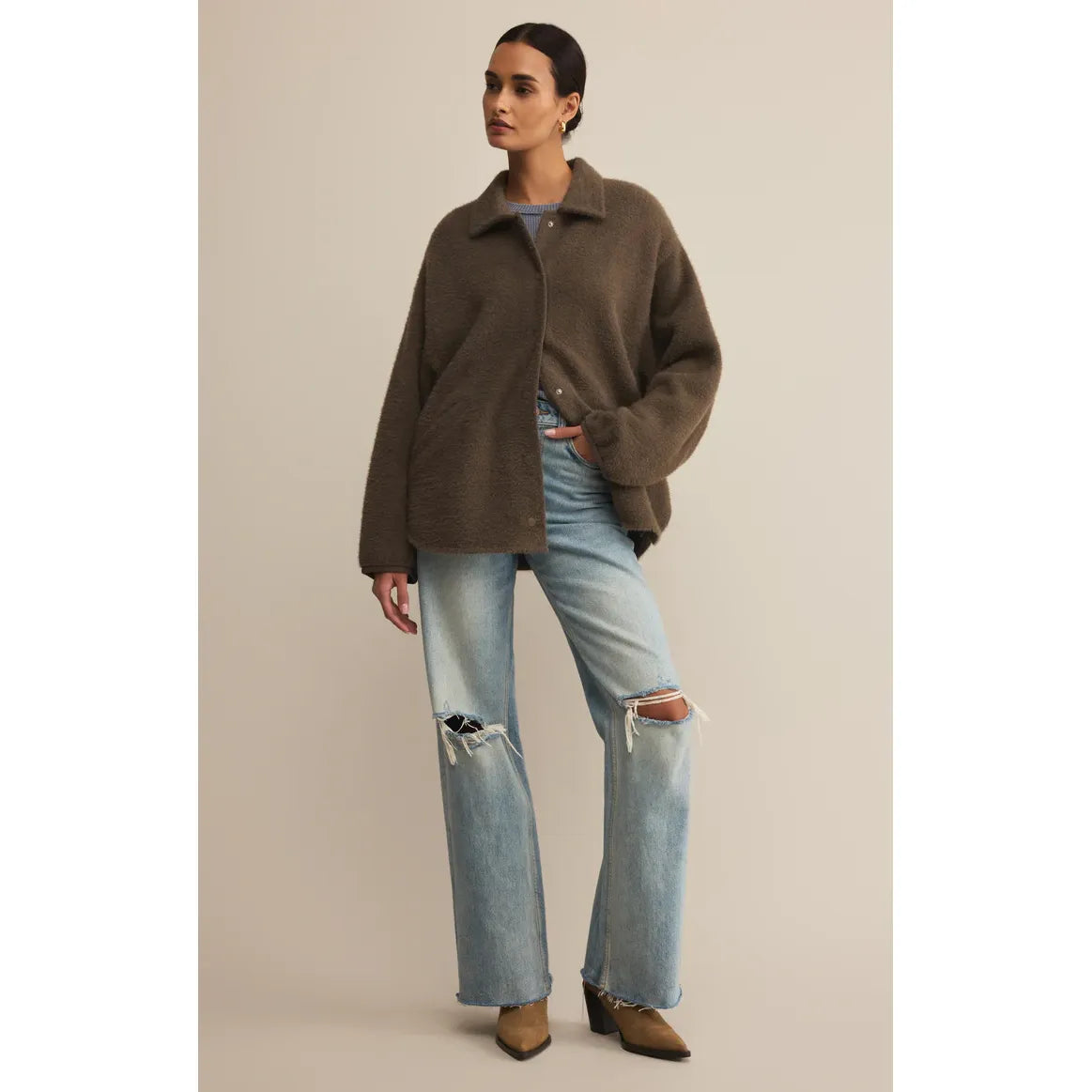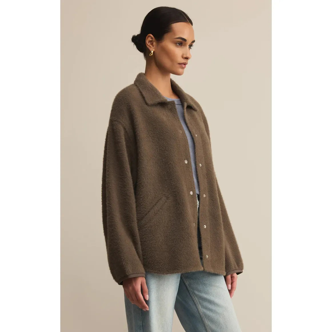 When you want cozy and cool, this oversized sweater-knit jacket has your back. Designed with dropped shoulders, welt pockets, and that plush, snuggle-worthy texture.