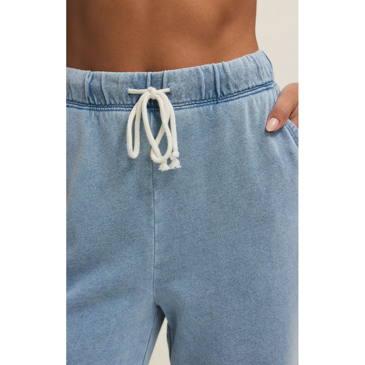 Say hello to your new go-to full-length pant, featuring side seam pockets and a fully functional drawcord waistband for that perfect fit. Made from lightweight knit denim, these pants combine style and comfort effortlessly for any occasion.