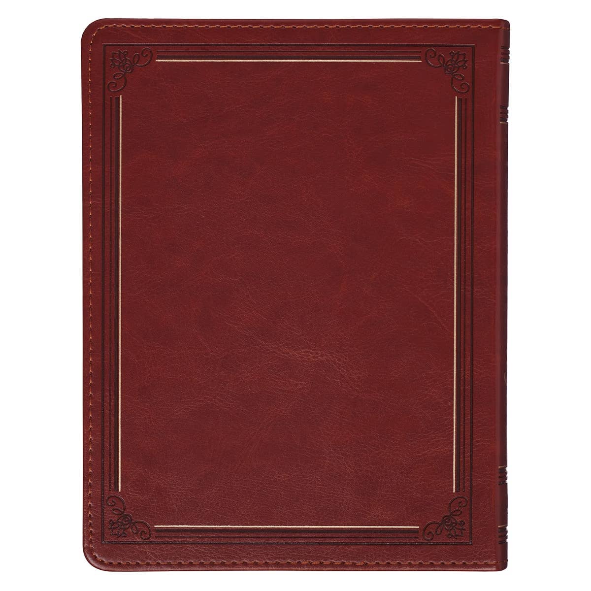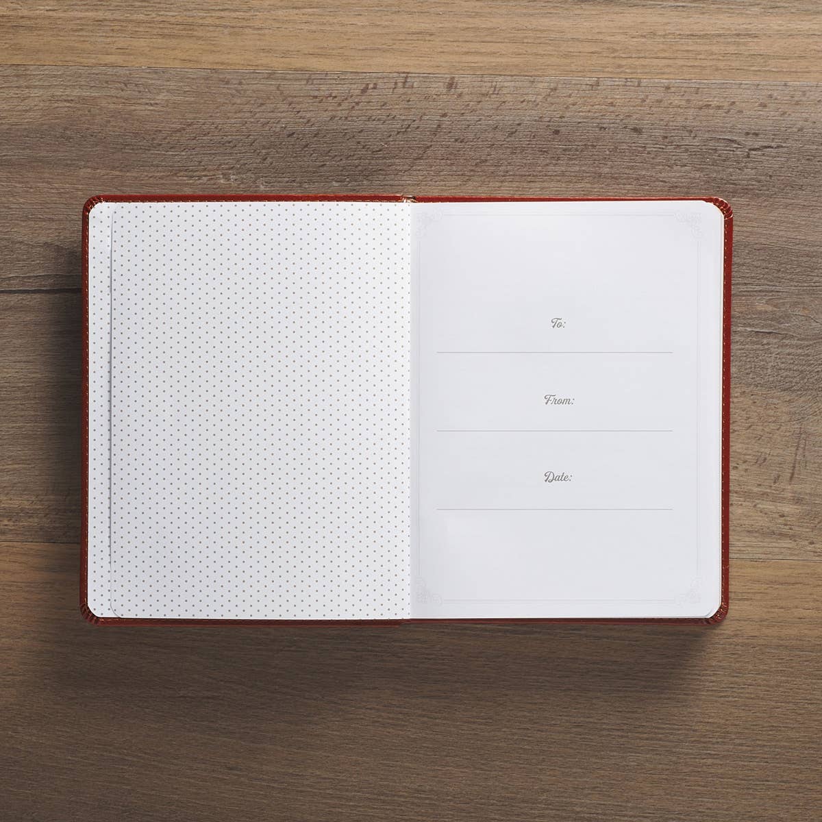 Heat-debossed frame design, Saddle-tan faux leather, Gold foil accents, Gold-foiled title, Two-color interior, Gilt-edged pages, 416 pages, 199 devotions, Attached ribbon page marker, Presentation page, Size: 7.8" x 6" x 1" (198 x 152 x 25mm),